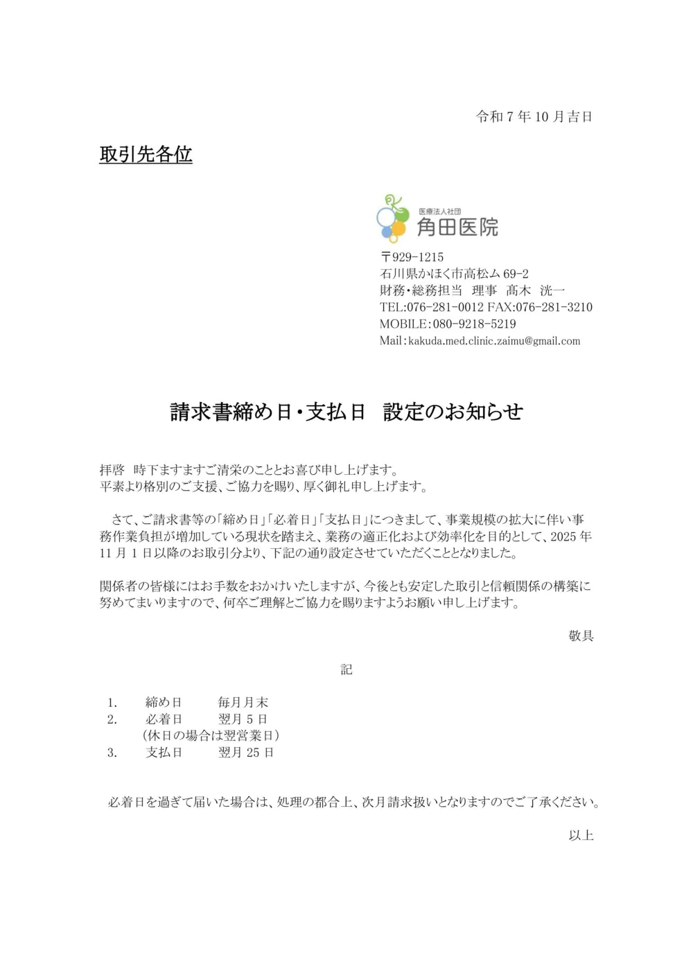 このたび当法人(かくだメディカルクリニック・通所リハビリテーション くつろぎ)では、事務処理体制の整備と業務効率化の一環として、請求書に関する締め日および支払日を以下の通り設定(口座振替除く)させていただくこととなりました。
