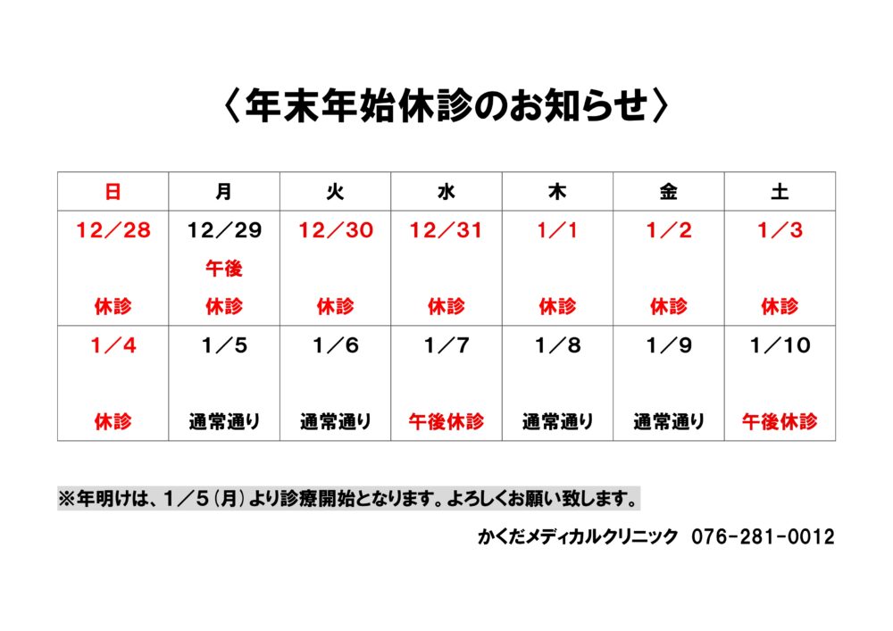 年末年始の診療体制につきまして、以下の通りご案内いたします。