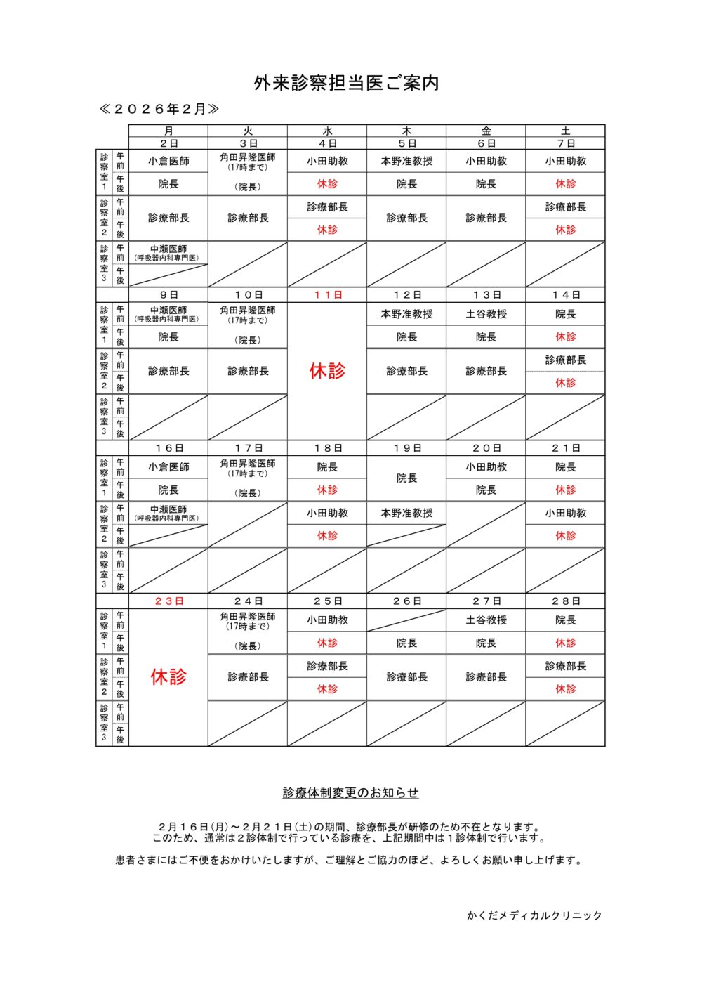 ※診療体制は、医師の都合等により急遽変更となる場合がございます。あらかじめご了承ください。